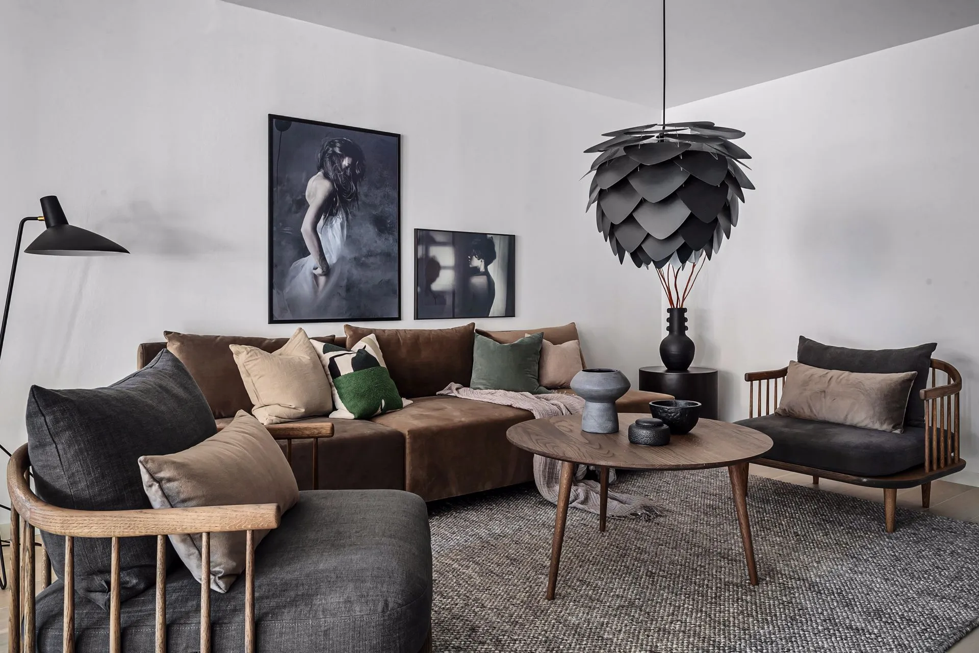 Sebuah dekorasi kontemporer Ornamen segar antara yang tidak berpengalaman, hitam dan kayu untuk sebuah flat. Tidak berpengalaman, perbedaannya dengan hitam, dan kayu adalah elemen dari flat modern yang terletak di konstruksi baru.
